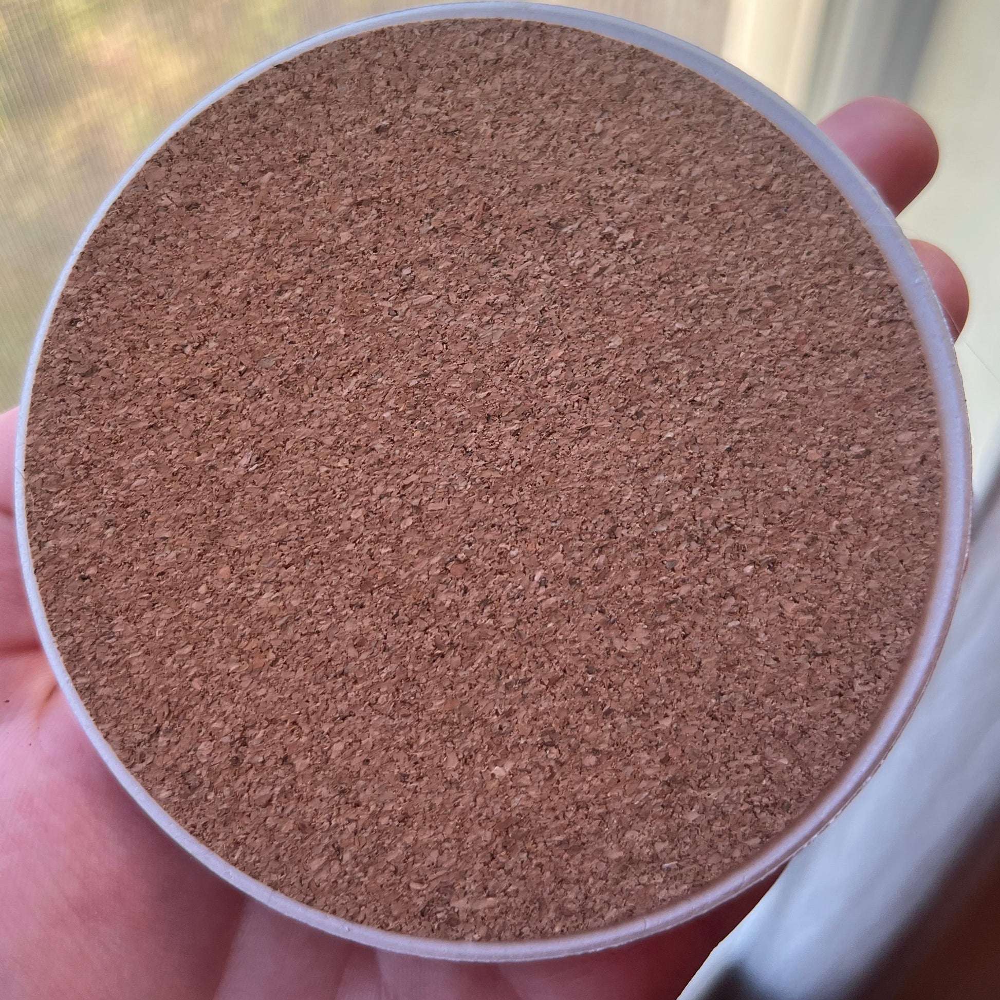 Ceramic top, glossy finish with cork bottom.