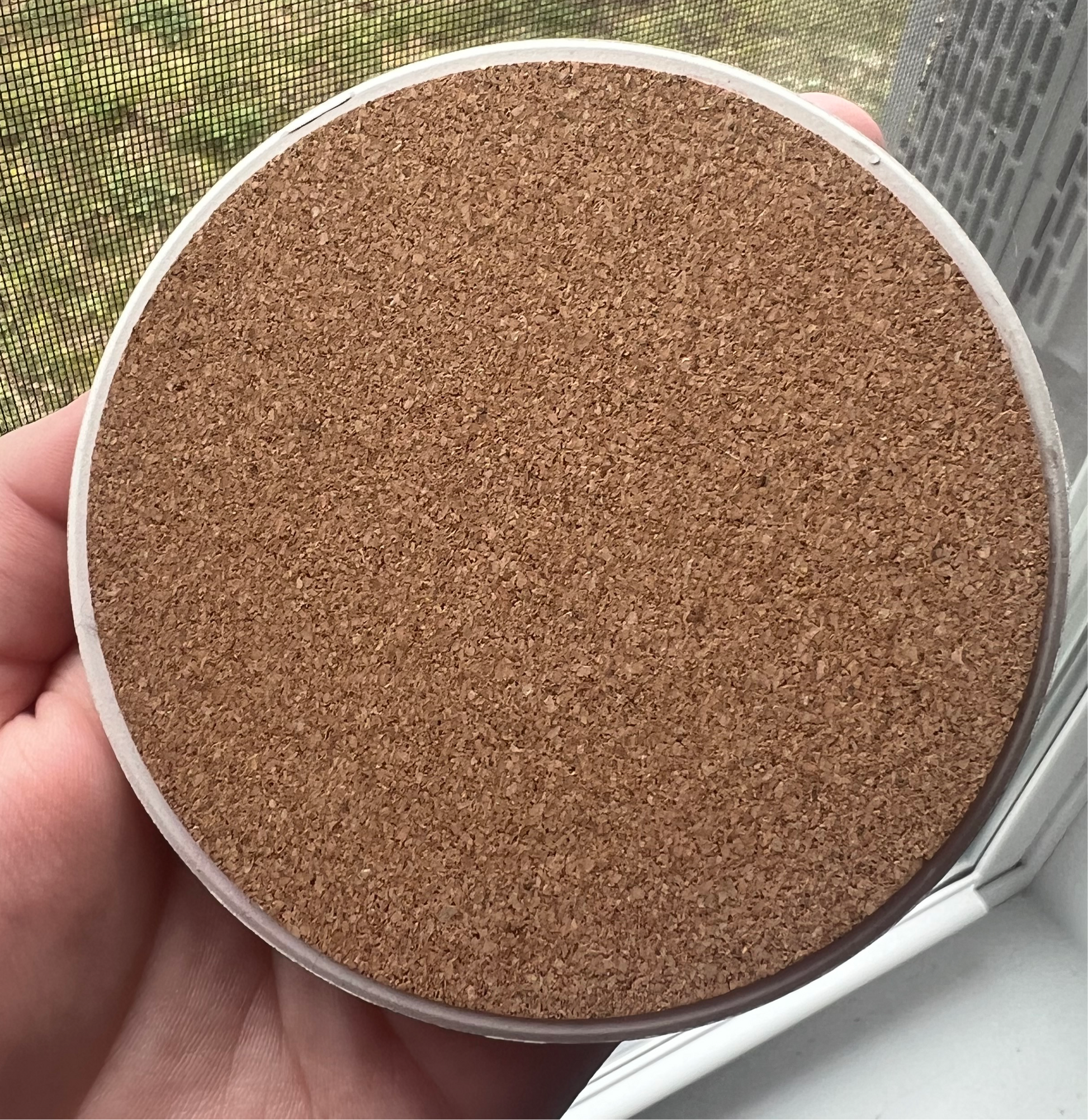 Ceramic top, glossy finish with cork bottom.